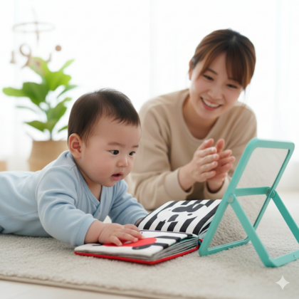鏡や音の鳴るガラガラを目の前に置くと、やる気スイッチがオンになります!