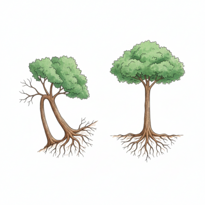 右は根をしっかりはって、土台が安定している木。(=姿勢が安定)