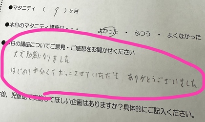 ご参加された方からみなさまからも今回のマタニティ講座は「よかった」と好評でした。(ほっと一安心。。。)